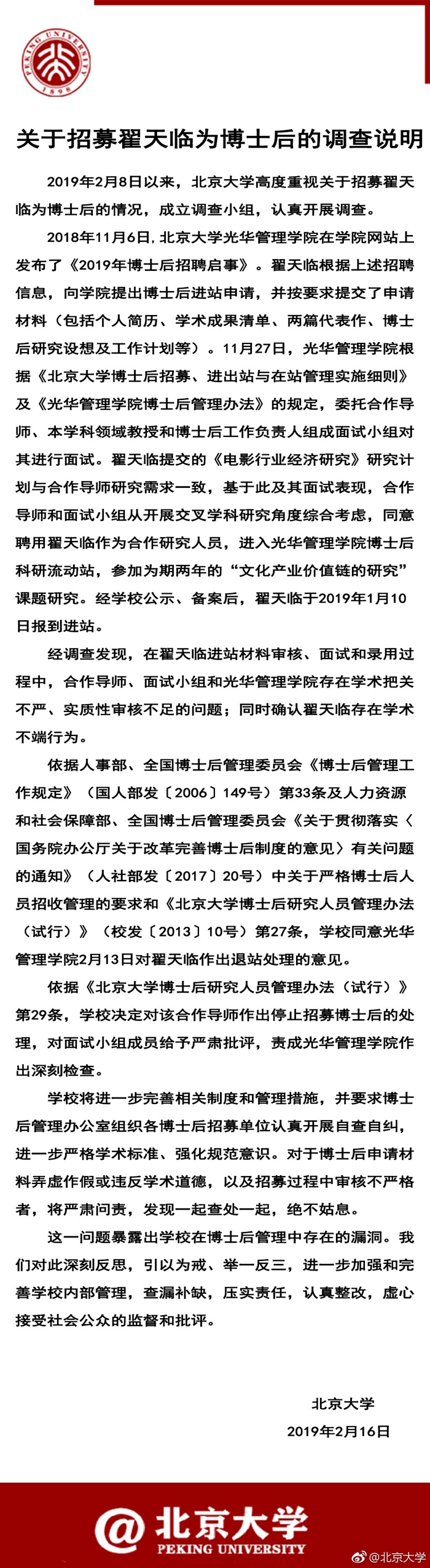 2月16日北京大學(xué)官方微博發(fā)布關(guān)于招募翟天臨為博士后的調(diào)查說(shuō)明。