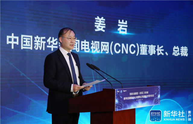 2月19日,新華社聯(lián)合搜狗公司在京發(fā)布全新升級的站立式AI合成主播并推出全球首個AI合成女主播。圖為中國新華新聞電視網(wǎng)有限公司(CNC)董事長、總裁姜巖致辭。新華社記者 肖磊濤 攝