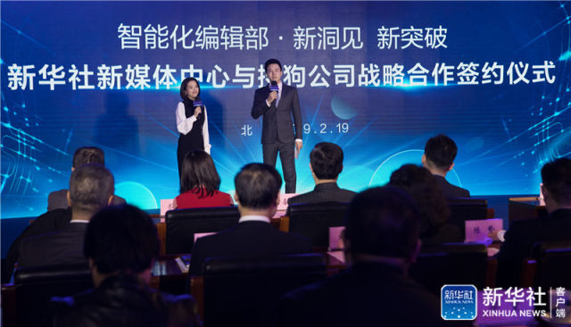2月19日,新華社聯(lián)合搜狗公司在京發(fā)布全新升級的站立式AI合成主播并推出全球首個AI合成女主播。圖為新華社副社長劉思揚(yáng)、搜狗公司CEO王小川共同啟動AI合成主播升級。新華社記者 肖磊濤 攝