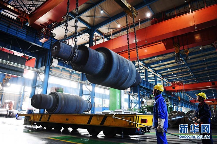 在中國(guó)一重集團(tuán)有限公司的生產(chǎn)車間,起重機(jī)吊起產(chǎn)品(2018年9月27日攝)。新華社記者 王建威 攝