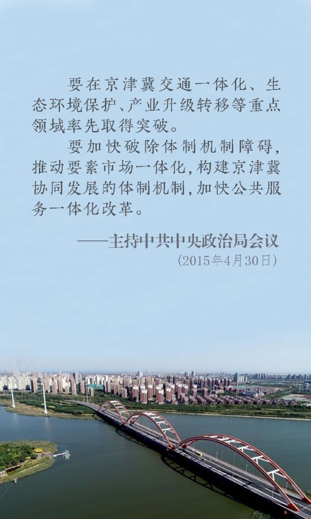 2013年5月,習(xí)近平總書記在天津調(diào)研時提出,要譜寫新時期社會主義現(xiàn)代化的京津“雙城記”。2013年8月,習(xí)近平總書記在北戴河主持研究河北發(fā)展問題時,又提出要推動京津冀協(xié)同發(fā)展??倳浂啻螐?qiáng)調(diào),解決好北京發(fā)展問題,必須納入京津冀和環(huán)渤海經(jīng)濟(jì)區(qū)的戰(zhàn)略空間加以考量,以打通發(fā)展的大動脈,更有力地彰顯北京優(yōu)勢,更廣泛地激活北京要素資源,同時天津、河北要實(shí)現(xiàn)更好發(fā)展也需要連同北京發(fā)展一起來考慮。