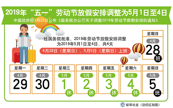 圖表:2019年“五一”勞動(dòng)節(jié)放假安排調(diào)整為5月1日至4日 新華社發(fā) 邊紀(jì)紅 制圖
