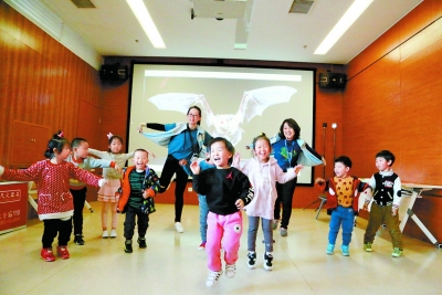 為了加強與孩子的互動,秀怡設計了許多游戲環(huán)節(jié),當然這些游戲都和故事相關。“孩子們,蝙蝠是怎么飛的呀?”在一次活動中,秀怡張開雙臂,擺出了模擬蝙蝠飛行的姿勢。她還用各種姿勢模仿出蝙蝠的超聲波,孩子們紛紛參與到游戲中來,聽完了故事,也學到了知識。“孩子都是喜歡玩游戲的,游戲激起了他們的興趣,他們對故事自然就會感興趣。”