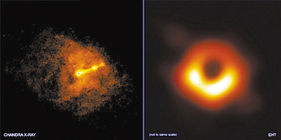 左圖 錢(qián)德拉X射線(xiàn)望遠(yuǎn)鏡與事件視界望遠(yuǎn)鏡同時(shí)拍攝的照片,顯示了M87星系中心黑洞的“相對(duì)論性噴流”。右圖 事件視界望遠(yuǎn)鏡拍攝的M87星系中心黑洞圖像。圖片來(lái)源:美國(guó)趣味科學(xué)網(wǎng)站