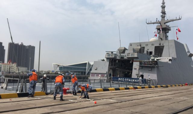 19日10時(shí)許,新加坡海軍“堅(jiān)強(qiáng)”號(hào)護(hù)衛(wèi)艦緩緩駛?cè)肭鄭u大港碼頭。這是參加中國人民解放軍海軍成立70周年多國海軍活動(dòng)到訪的第一艘外國海軍艦艇。新華社記者梅世雄 攝