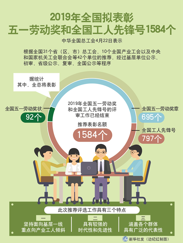 新華社北京4月22日電(記者樊曦)中華全國總工會(huì)22日表示,根據(jù)全國31個(gè)省(區(qū)、市)總工會(huì)、10個(gè)全國產(chǎn)業(yè)工會(huì)以及中央和國家機(jī)關(guān)工會(huì)聯(lián)合會(huì)等42個(gè)單位的推薦,經(jīng)過基層單位公示、初審、省級(jí)公示、復(fù)審、全國公示等程序,2019年全國五一勞動(dòng)獎(jiǎng)和全國工人先鋒號(hào)的評(píng)審工作已經(jīng)結(jié)束,推薦表彰名額1584個(gè)。