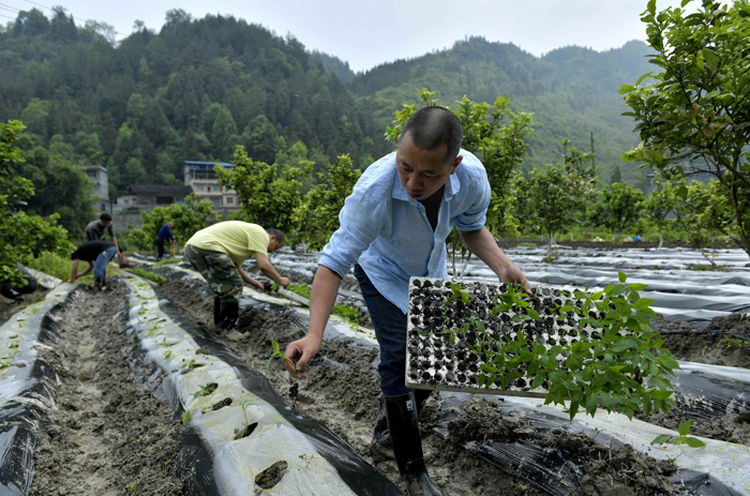 湖北宣恩縣直機(jī)關(guān)干部與村民一起移栽辣椒苗