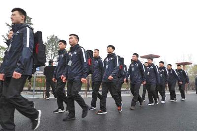 在世園會內(nèi)列隊“巡邏”的快遞小哥。快遞公司世園會站點供圖