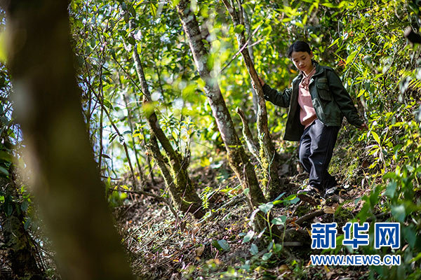 云南貢山縣獨(dú)龍江鄉(xiāng)巴坡村森林資源管護(hù)隊(duì)小隊(duì)長木秋云在林間巡護(hù)(4月25日攝)。新華社記者 江文耀 攝