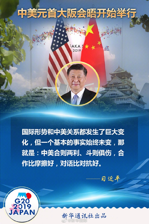 習近平在會晤開始時說,很高興同總統先生在大阪見面。48年前,也就是1971年,就在離這里100多公里的名古屋,參加第三十一屆世界乒乓球錦標賽的中美乒乓球運動員進行了友好互動,這就是后來人們說的“乒乓外交”的開啟,創(chuàng)造了“小球轉動大球”的歷史佳話。8年之后的1979年,中美建立了外交關系。回顧建交以來的40年,國際形勢和中美關系都發(fā)生了巨大變化,但一個基本的事實始終未變,那就是:中美合則兩利、斗則俱傷,合作比摩擦好,對話比對抗好。近來,我同總統先生通過電話和書信保持著密切聯系。今天,我愿同總統先生就事關中美關系發(fā)展的根本性問題交換意見,為下階段兩國關系發(fā)展定向把舵,推進以協調、合作、穩(wěn)定為基調的中美關系。
