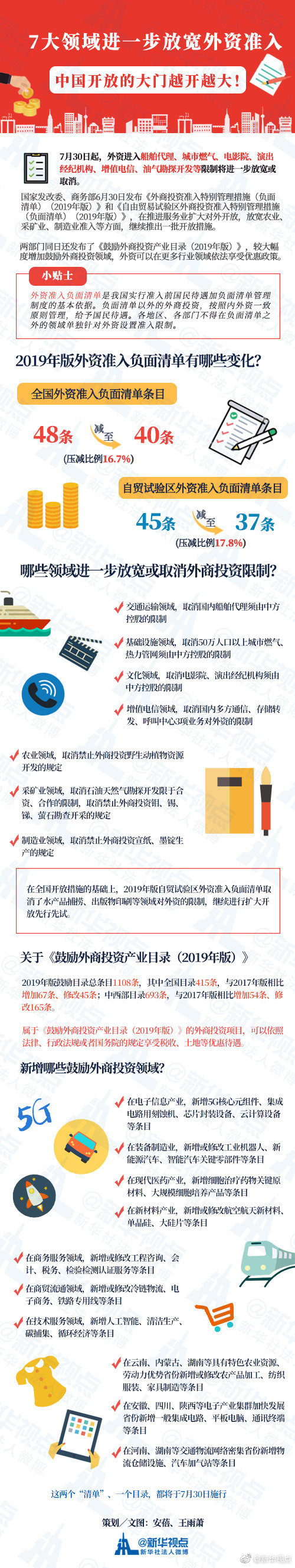 7月30日起,外資進(jìn)入船舶代理、城市燃?xì)?、電影院、演出?jīng)紀(jì)機(jī)構(gòu)、增值電信、油氣勘探開發(fā)等限制將進(jìn)一步放寬或取消。國家發(fā)改委、商務(wù)部6月30日發(fā)布《外商投資準(zhǔn)入特別管理措施(負(fù)面清單)(2019年版)》,清單條目由48條減至40條。同日發(fā)布的《自由貿(mào)易試驗(yàn)區(qū)外商投資準(zhǔn)入特別管理措施(負(fù)面清單)(2019年版)》條目由45條減至37條。(記者安蓓、王雨蕭)?
