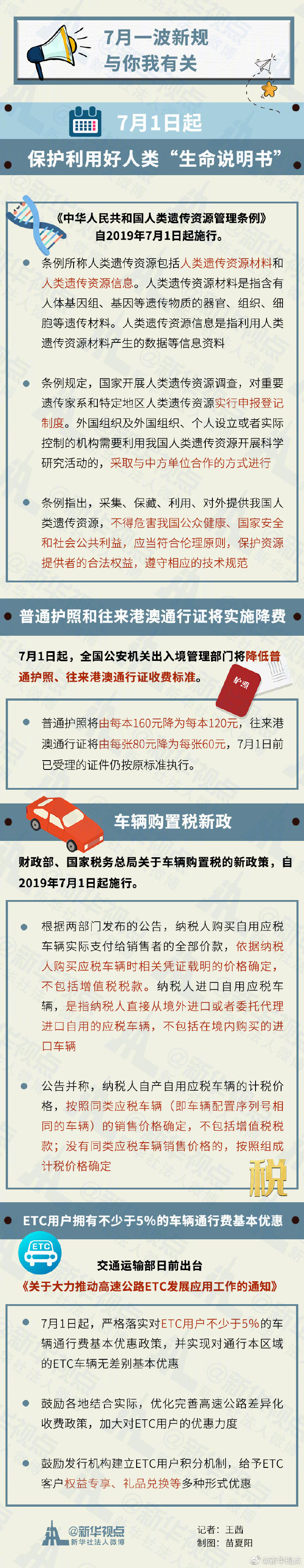 保護(hù)利用好人類(lèi)“生命說(shuō)明書(shū)”;普通護(hù)照和往來(lái)港澳通行證將實(shí)施降費(fèi);車(chē)輛購(gòu)置稅新政7月1日起施行;ETC用戶(hù)擁有不少于5%的車(chē)輛通行費(fèi)基本優(yōu)惠……7月1日起,一批與你我有關(guān)的新規(guī)將正式施行。戳圖帶你了解干貨??,轉(zhuǎn)發(fā)周知! ????