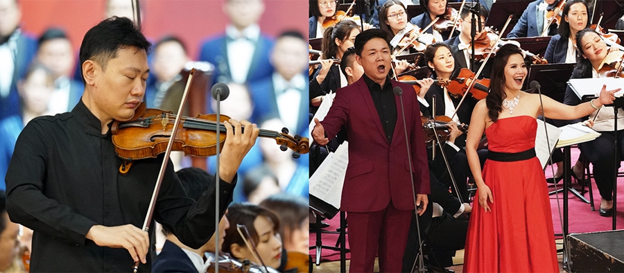 擔(dān)任《梁祝》小提琴獨(dú)奏的陳曦(上左),17歲就獲得第12屆柴可夫斯基國(guó)際音樂(lè)比賽小提琴銀獎(jiǎng),那屆金獎(jiǎng)可是空缺的哦。青年男高音歌唱家王傳越(右圖左)曾獲2015年第15屆柴可夫斯基大賽銀獎(jiǎng),女高音歌唱家宋元明(右圖右)曾獲第48屆法國(guó)圖盧茲國(guó)際聲樂(lè)大賽第一名。