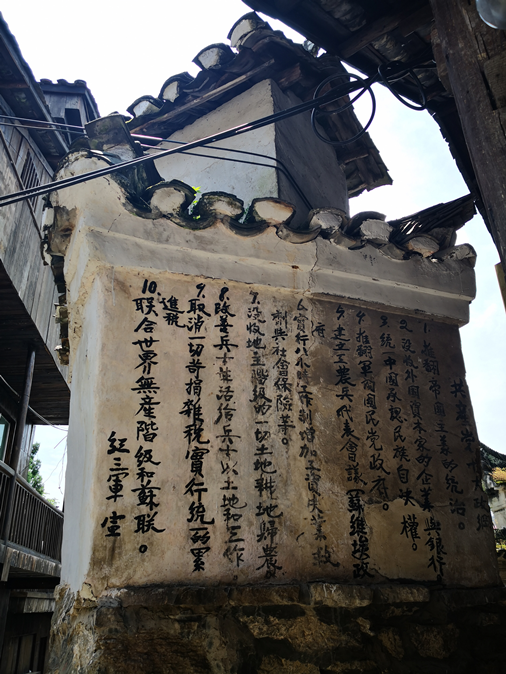 當(dāng)?shù)靥峁┑氖妨仙线@樣記載著:1934年6月,賀龍率領(lǐng)的紅三軍駐扎此地時(shí),宣傳隊(duì)隊(duì)長(zhǎng)樊哲祥同志,用毛筆在土地廟側(cè)墻上抄錄了中共六大確立的《中國(guó)共產(chǎn)黨十大政綱》。其內(nèi)容為: