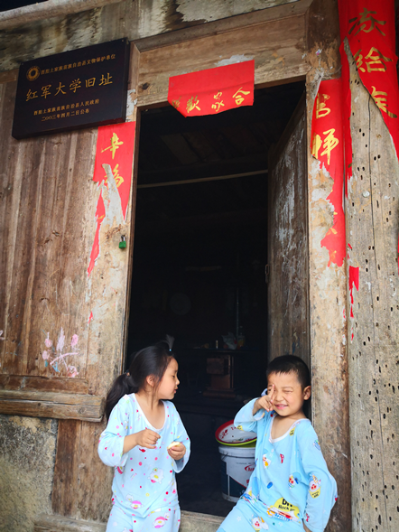 告別了土地廟,沿著紅軍街繼續(xù)東行,上一道坡來(lái)到紅軍大學(xué)遺址。這座普通的民房雖然掛著文物的標(biāo)識(shí),如今還有人家居住在此。一個(gè)4歲的小男孩和他6歲的姐姐坐在門(mén)檻上看著我們,小女孩有點(diǎn)害羞,小男孩說(shuō)話(huà)干脆利落。我倆有了如下對(duì)話(huà):