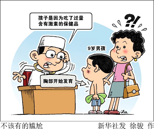 9歲的成都男孩浩浩,遇到了這個(gè)年齡和性別不該有的尷尬,他的胸部竟然開始發(fā)育了。經(jīng)醫(yī)生診斷,孩子是因?yàn)槌粤诉^量含有激素的保健品。類似浩浩這樣因?yàn)榉帽=∑穾砩眢w損傷的例子并不少見。