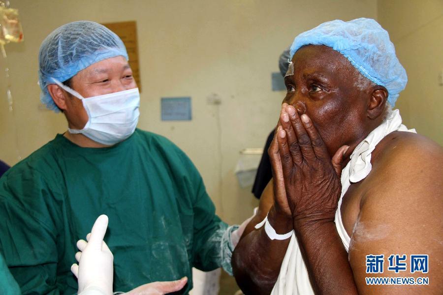 2010年11月23日,在津巴布韋首都哈拉雷郊區(qū)的奇通圭扎中心醫(yī)院,一位老人(右)在中國“非洲光明行”醫(yī)療隊為其實施復(fù)明手術(shù)后重見光明,驚喜萬分。 新華社記者 李平 攝