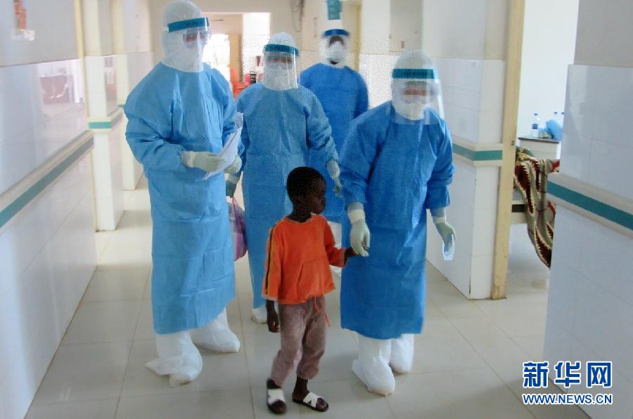 2014年10月11日,在塞拉利昂首都弗里敦,來自中國的醫(yī)護人員護送埃博拉留觀患者進入病房。新華社發(fā)(孫捷 攝)