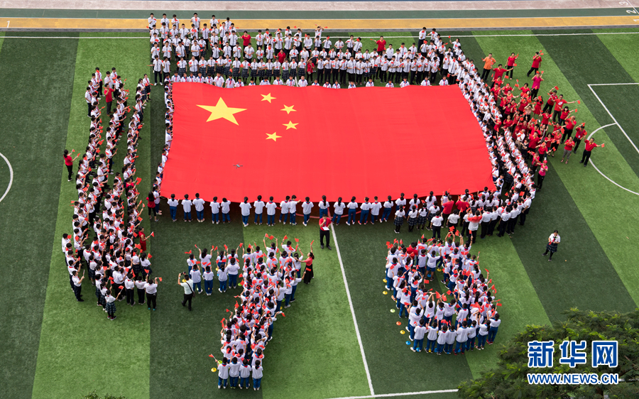 一面巨幅國旗在廣州市陳嘉庚紀念中學(xué)綠茵操場上格外引人注目(9月1日攝)。新華社發(fā)