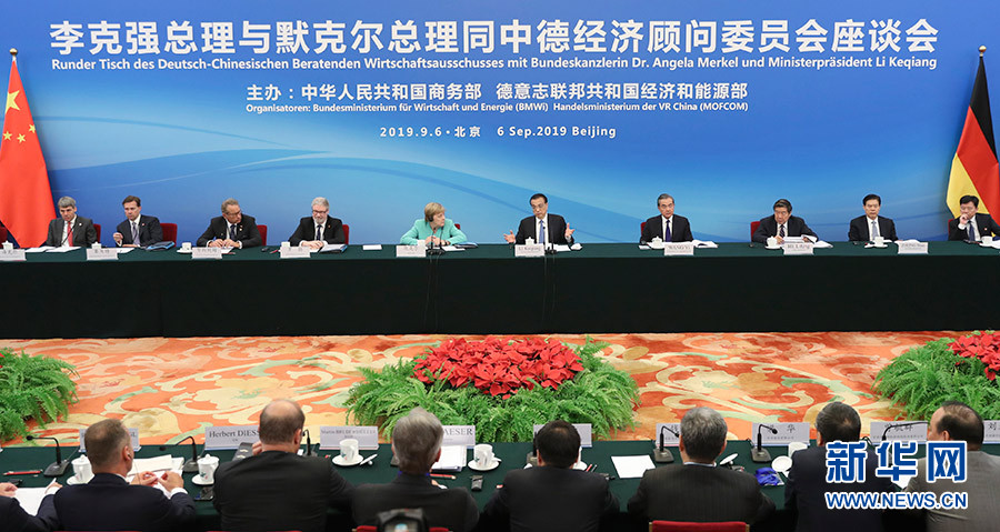 9月6日,國(guó)務(wù)院總理李克強(qiáng)在北京人民大會(huì)堂與德國(guó)總理默克爾共同出席中德經(jīng)濟(jì)顧問委員會(huì)座談會(huì),并同與會(huì)代表交流。 新華社記者 丁海濤 攝