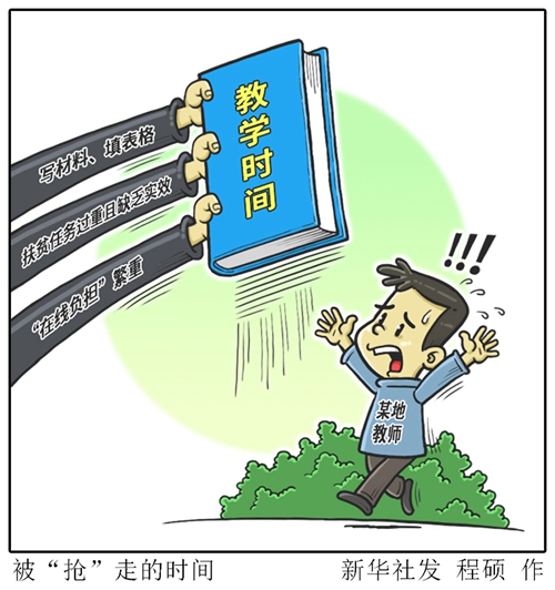今年9月,中央深改委審議通過(guò)《關(guān)于減輕中小學(xué)教師負(fù)擔(dān)進(jìn)一步營(yíng)造教育教學(xué)良好環(huán)境的若干意見(jiàn)》,要求讓中小學(xué)教師潛心教書、靜心育人。記者走訪發(fā)現(xiàn),評(píng)比考核過(guò)多、無(wú)關(guān)社會(huì)事務(wù)進(jìn)校園、頻繁抽調(diào)中小學(xué)教師等“槽點(diǎn)”仍在多地存在。