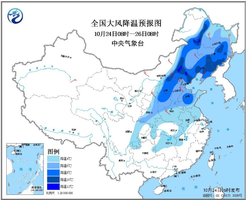 而今天起,冷空氣將會繼續(xù)南下逐步影響中東部地區(qū),中央氣象臺預計,10月24日08時至26日08時,西北地區(qū)東部、東北大部、華北、黃淮、江淮、四川盆地、湖北西部和東部、湖南北部、江西西北部等地的部分地區(qū)氣溫將下降4~8℃,其中內蒙古中部偏東和東北部、東北地區(qū)東南部等地的部分地區(qū)降溫可達10℃以上,并伴有4~6級偏北風、陣風7~8級。