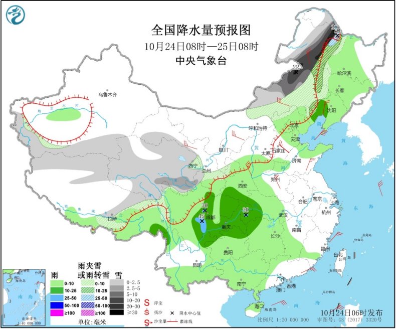 冷空氣不僅制造降溫,今明兩天還會給東北、華北等地制造雨雪天氣,同時華西地區(qū)的陰雨也將延綿不絕。中央氣象臺預計,10月24日08時至25日08時,黑龍江西部、內蒙古中東部、甘肅南部、青海、西藏東部等地的部分地區(qū)有小到中雪或雨夾雪,其中內蒙古中部偏北和東北部、黑龍江西北部等地有大雪,局地暴雪或大暴雪;遼寧西南部、西南地區(qū)東部、湖北西南部、湖南西北部等地的部分地區(qū)有中雨,局地大雨(25~45毫米)。