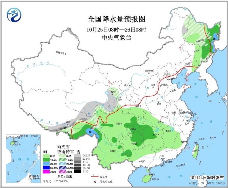 10月25日08時至26日08時,內蒙古東北部、黑龍江中部、西藏東北部和南部、青海東部和南部、甘肅河西等地的部分地區(qū)有小到中雪或雨夾雪,其中西藏南部局地有大雪。東北地區(qū)東部、西藏東南部、四川盆地中東部、湖南西部、貴州等地的部分地區(qū)有中雨,局地有大雨(25~40毫米)。