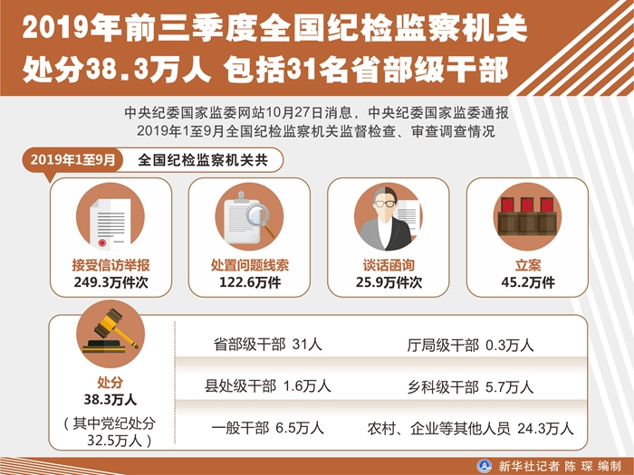 新華社北京10月27日電(記者朱基釵)中央紀(jì)委國(guó)家監(jiān)委網(wǎng)站27日消息,中央紀(jì)委國(guó)家監(jiān)委通報(bào)2019年1至9月全國(guó)紀(jì)檢監(jiān)察機(jī)關(guān)監(jiān)督檢查、審查調(diào)查情況。2019年1至9月,全國(guó)紀(jì)檢監(jiān)察機(jī)關(guān)共接受信訪舉報(bào)249.3萬(wàn)件次,立案45.2萬(wàn)件,處分38.3萬(wàn)人,包括省部級(jí)干部31人,廳局級(jí)干部0.3萬(wàn)人。