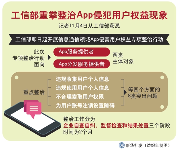新華社北京11月4日電(記者張辛欣)記者4日從工信部獲悉,工信部即日起開展信息通信領域App侵害用戶權益專項整治行動。對違規(guī)收集用戶個人信息、違規(guī)使用用戶個人信息等8類突出問題重拳整治。