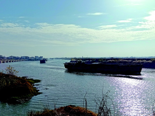 在江蘇省西南角的南京市高淳區(qū),有條古老的人工運河——胥河,開鑿至今已2500余年。11月19日傍晚,東壩街道新建的廣通橋沐浴在落日余暉下,幾艘滿載貨物的大鐵船,順胥河?xùn)|下,前方是常州、無錫、蘇州。波瀾不驚,船上小狗興奮地對著岸上的人們吠叫。次日晨,記者趕到東壩上游固城街道胥河沿線,又見七八艘大鐵船逶迤逆行西上,指向蕪湖乃至更遠的地方。水清河寬,天高云淡,心曠神怡。