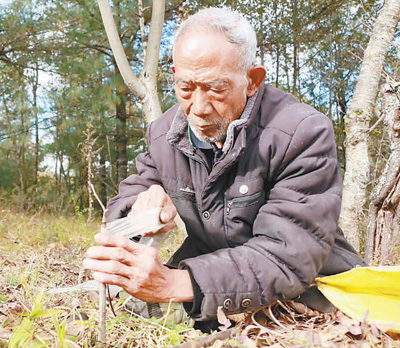 楊廷相不想放棄。隊上見他堅持,就沒有再反對。這樣,楊廷相“爬爬跪跪”進了林地,在密林深處搭起了一個窩棚,從此過著“天不亮就起,天不黑不歸”的生活。妹妹楊廷花每天給大哥送點包谷面和咸菜。家里人苦勸他幾次回家未果后,也就放棄了。楊廷相守林“認樹不認人”,但又注意方式方法,發(fā)現(xiàn)有人偷砍,他會在砍鑿處釘上一顆釘子,偷砍者下次就不好再動手了。10年寒暑,楊廷相照看的林地始終是真峰村最好的。楊科禁不住感嘆,真沒想到,殘疾人比正常人管得還好!