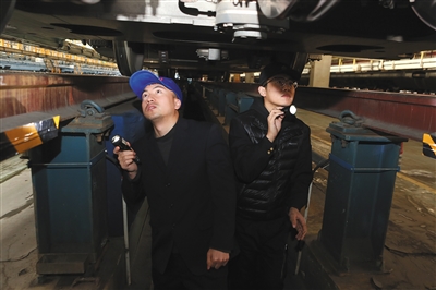1月13日,北京動(dòng)車段南所,一級(jí)修車間高鐵機(jī)械師皮春成(左)和楊雪松(右)在檢查油跡。