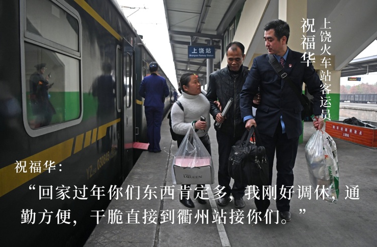 祝福華是上饒火車站的一名客運(yùn)員,經(jīng)常在車站碰到他們,每次都熱心地幫忙提行李,護(hù)送進(jìn)出站,日子久了就互相留了電話和微信以方便聯(lián)系。只要魯師傅夫婦有需要,即便沒在班上,祝福華也會趕到車站幫助他們。