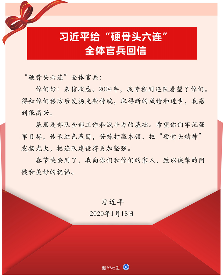 新華社北京1月19日電 中共中央總書記、國家主席、中央軍委主席習(xí)近平1月18日給74集團(tuán)軍某旅“硬骨頭六連”全體官兵回信,勉勵他們牢記強(qiáng)軍目標(biāo),傳承紅色基因,苦練打贏本領(lǐng),把“硬骨頭精神”發(fā)揚(yáng)光大,把連隊建設(shè)得更加堅強(qiáng),并向官兵們和他們的家人致以新春祝福?;匦湃娜缦拢?/p>