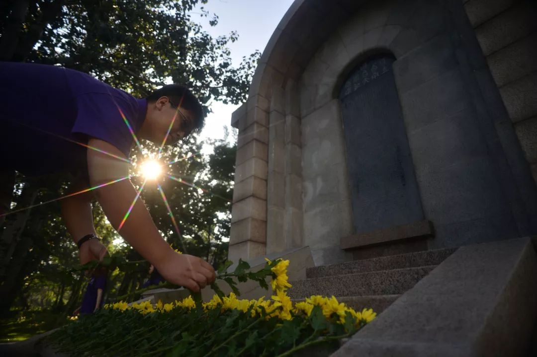 2015年9月3日,在天津南開大學校園內(nèi)的西南聯(lián)合大學紀念碑前,師生代表向南開抗戰(zhàn)英烈獻花