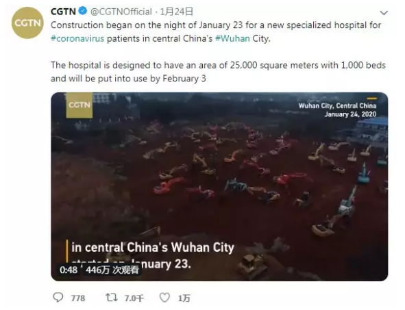 昨晚,CGTN在推特發(fā)布的一條關(guān)于武漢火神山醫(yī)院工地施工現(xiàn)場(chǎng)的視頻一舉沖上該平臺(tái)國(guó)際新聞首頁(yè)熱門,觀看量超446萬(wàn),超過(guò)153萬(wàn)的全球網(wǎng)友參與互動(dòng)。