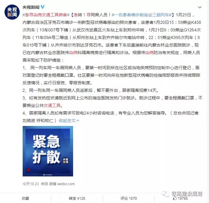 1月25日,內(nèi)蒙古自治區(qū)牙克石市確診一例新型冠狀病毒感染的肺炎患者,該患者1月20日15:59乘坐K458次列車(13車007號下鋪)從武漢市武昌區(qū)火車站上車到鄭州中轉(zhuǎn),1月21日8:09乘坐G1264次列車(11車09A號二等座)從鄭州東站上車到齊齊哈爾市南站中轉(zhuǎn),22:51乘坐K995次列車(8車018號下鋪)從齊齊哈爾市到達(dá)牙克石市。該患者下車后直接前往內(nèi)蒙古林業(yè)總醫(yī)院就診,現(xiàn)已在內(nèi)蒙古林業(yè)總醫(yī)院傳染病科隔離病房進(jìn)行隔離和診治。根據(jù)傳染病防治有關(guān)規(guī)定,同乘人員需采取如下防護(hù)措施: 1、 同一列車同一車廂同乘人員,要第一時間到所在社區(qū)或當(dāng)?shù)丶膊☆A(yù)防控制中心進(jìn)行登記,面對面登記時要全程佩戴口罩。社區(qū)要第一時間向所在地新型冠狀病毒防控指揮部報告并持續(xù)跟蹤反饋情況,實行日報告、零報告制度。 2、同一列車同一車廂同乘人員返家后,暫不要外出,居家隔離觀察14天。 3、如有發(fā)熱癥狀請就近到網(wǎng)上公布的指定醫(yī)院發(fā)熱門診就診。就診過程中,要全程佩戴口罩,不要乘坐公共交通工具。