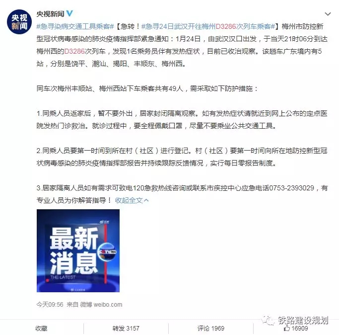 梅州市防控新型冠狀病毒感染的肺炎疫情指揮部緊急通知:1月24日,由武漢漢口出發(fā),于當(dāng)天21時06分到達(dá)梅州西的D3286次列車,發(fā)現(xiàn)1名乘務(wù)員伴有發(fā)熱癥狀,目前已收治觀察。該趟車廣東境內(nèi)有5站,分別是饒平、潮汕、揭陽、豐順東、梅州西。同車次梅州豐順站、梅州西站下車乘客共有49人,需采取如下防護(hù)措施: 1、同乘人員返家后,暫不要外出,居家封閉隔離觀察。如有發(fā)熱癥狀請就近到網(wǎng)上公布的定點醫(yī)院發(fā)熱門診救治。就診過程中,要全程佩戴口罩,盡量不要乘坐公共交通工具。 2、同乘人員要第一時間到所在村(社區(qū))進(jìn)行登記。村(社區(qū))要第一時間向所在地防控新型冠狀病毒感染的肺炎疫情指揮部報告并持續(xù)跟蹤反饋情況,實行每日零報告制度。 3、居家隔離人員如有需求可致電120急救熱線咨詢或聯(lián)系市疾控中心應(yīng)急電話0753-2393029,有專業(yè)人員為你解答指導(dǎo)!