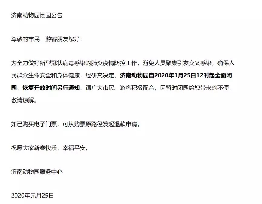 吉林、山東、湖北等地宣布叫停與野生動(dòng)物相關(guān)一切交易和展演活動(dòng)。陜西省林業(yè)局出臺(tái)十項(xiàng)措施,確保人與動(dòng)物的安全距離。1月22日起,武漢市動(dòng)物園、九峰森林動(dòng)物園等景區(qū)都已經(jīng)暫停對(duì)外開(kāi)放。原本計(jì)劃春節(jié)不打烊的濟(jì)南野生動(dòng)物世界,從1月25日12時(shí)起就宣布閉園。飼養(yǎng)員每天按照既定的消毒制度,對(duì)籠舍及舍外活動(dòng)場(chǎng)進(jìn)行消毒。