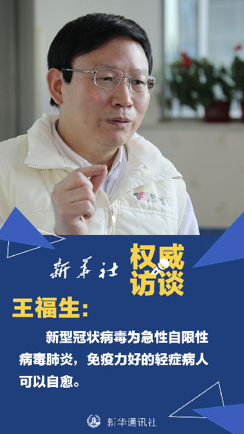 王福生:給大家普及一個概念,新型冠狀病毒肺炎它本身是一種急性自限性的疾病。什么叫自限性的呢?有的輕癥病人,他不經(jīng)過治療可以自己好,其它重癥病例通過治療才能恢復(fù)。這個過程中間,他有一種叫自己好的“自愈”,所以說我覺得“自愈”加上“治愈”,如果他癥狀輕,肺部的病變不嚴重,免疫力又比較好,這樣通過自身抗病毒的能力,就很快地把病毒控制了,但這可能得有3周左右。