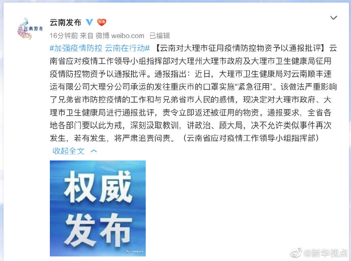 通報(bào)指出:近日,大理市衛(wèi)生健康局對云南順豐速運(yùn)有限公司大理分公司承運(yùn)的發(fā)往重慶市的口罩實(shí)施“緊急征用”。該做法嚴(yán)重影響了兄弟省市防控疫情的工作和與兄弟省市人民的感情,現(xiàn)決定對大理市政府、大理市衛(wèi)生健康局進(jìn)行通報(bào)批評,責(zé)令立即返還被征用的物資。通報(bào)要求,全省各地各部門要以此為戒,深刻汲取教訓(xùn),講政治、顧大局,決不允許類似事件再次發(fā)生,若有發(fā)生,將嚴(yán)肅追責(zé)問責(zé)。