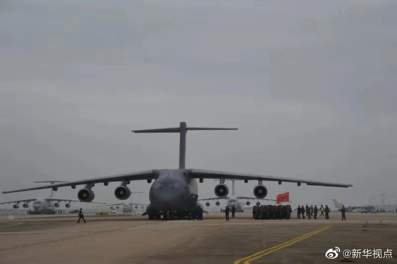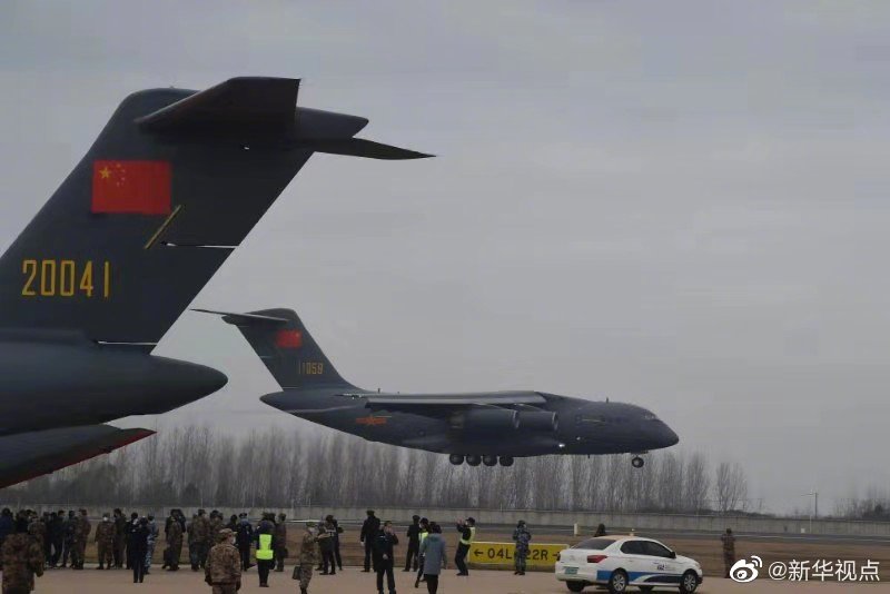 軍隊(duì)增派2600名醫(yī)護(hù)人員支援武漢抗擊新冠肺炎疫情。國產(chǎn)大型運(yùn)輸機(jī)運(yùn)-20“胖妞”首次參加非戰(zhàn)爭軍事行動(dòng)。13日,空軍出動(dòng)3型11架運(yùn)輸機(jī)多地同步向武漢空運(yùn)醫(yī)療隊(duì)員抵達(dá)武漢天河機(jī)場。(新華社記者黎云攝) ????