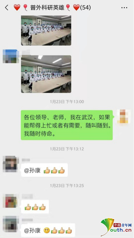 1月23日,看著老師奮戰(zhàn)在抗疫一線,他便主動請求上“戰(zhàn)場”。不過,由于他的專業(yè)是外科,因此未被選中。1月24日,孫康在工作群里又得到通知,“醫(yī)院可能抽組醫(yī)療隊支援地方,進(jìn)行報名登記”。他便立即二次“請戰(zhàn)”。