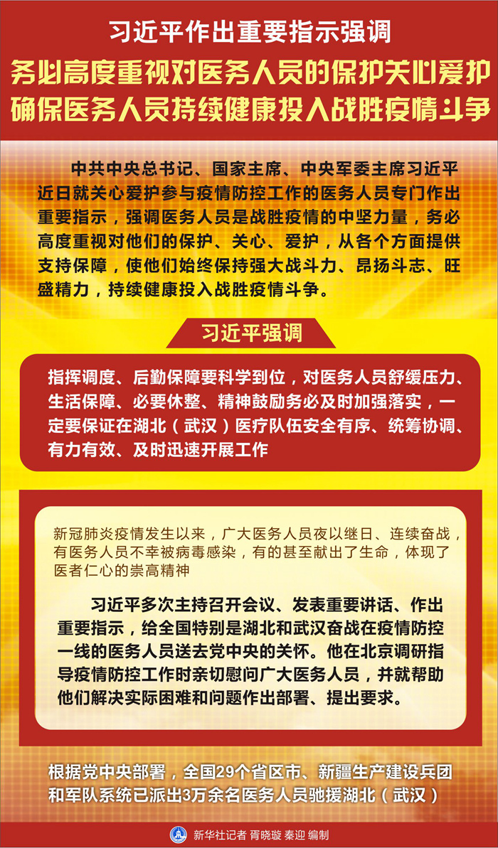習(xí)近平強(qiáng)調(diào),指揮調(diào)度、后勤保障要科學(xué)到位,對醫(yī)務(wù)人員舒緩壓力、生活保障、必要休整、精神鼓勵務(wù)必及時加強(qiáng)落實(shí),一定要保證在湖北(武漢)醫(yī)療隊(duì)伍安全有序、統(tǒng)籌協(xié)調(diào)、有力有效、及時迅速開展工作。