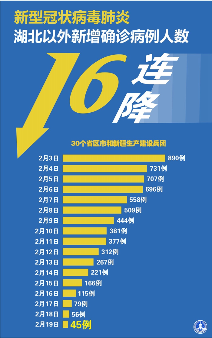 截至2月19日24時,據(jù)31個?。ㄗ灾螀^(qū)、直轄市)和新疆生產(chǎn)建設(shè)兵團(tuán)報告,現(xiàn)有確診病例56303例(其中重癥病例11864例),累計治愈出院病例16155例,累計死亡病例2118例,累計報告確診病例74576例(江西、河南、云南省各核減1例),現(xiàn)有疑似病例4922例。累計追蹤到密切接觸者589163人,尚在醫(yī)學(xué)觀察的密切接觸者126363人。