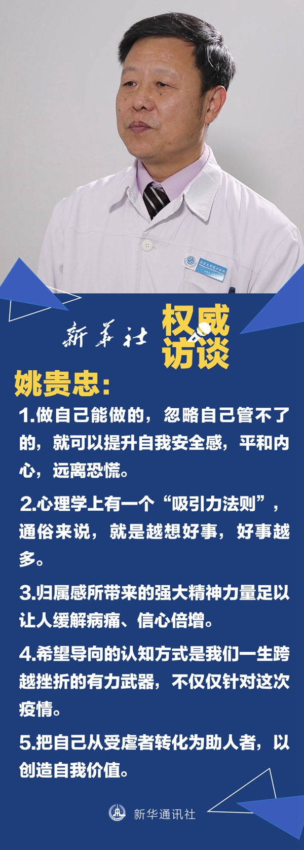 姚貴忠:知足感可以給你精神上的力量。在這次疫情中,我們可以做一些比較,比如:悶在家里不能出門,總比被困郵輪上的游客好吧?家人患病被隔離,總比病情危重甚至失去生命好吧?