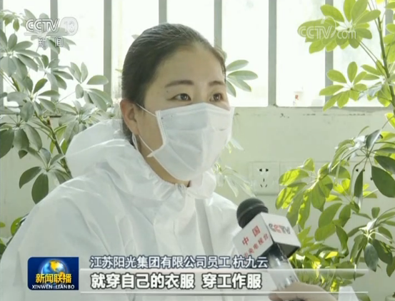 江蘇陽光集團有限公司員工 杭九云:完全不一樣,我們平時干活的話,就穿自己的工作服,穿廠服就好了,現(xiàn)在來了,要穿這個密不透風(fēng),我感覺醫(yī)生還要比我們不容易,他們還要去救人,其實他們比我們還要更累,所以堅持吧。