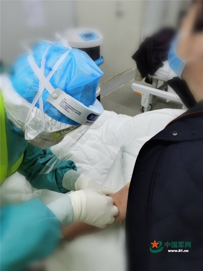 今天的主要任務(wù)是給18名病人抽血。這項(xiàng)平時(shí)對(duì)我來說簡(jiǎn)單的不能再簡(jiǎn)單的任務(wù),此刻卻充滿了挑戰(zhàn)性??谡?、帽子、手套、防護(hù)服、護(hù)目鏡、防護(hù)面屏都給抽血帶來了極大的困難,呼出的熱氣讓護(hù)目鏡變得模糊,昏暗的燈光讓本就有限的視線變得更加不足,三層防護(hù)手套讓抽血也變得毫無手感。在抽血過程中,一個(gè)大媽問道:“姑娘,你們是來自部隊(duì)的么?”我看著她那親切的眼神,笑著點(diǎn)了點(diǎn)頭。大媽露出了信任的微笑,“有你們?cè)?,我就放心了?!边@句話讓我的內(nèi)心久久不能平靜。