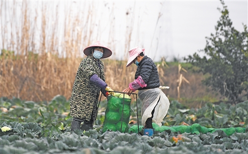 2月26日,湖北黃岡市黃州區(qū)路口鎮(zhèn)夾洲村,豐實(shí)蔬菜種植專業(yè)合作社的社員正在收蔬菜。本報(bào)記者 高興貴攝